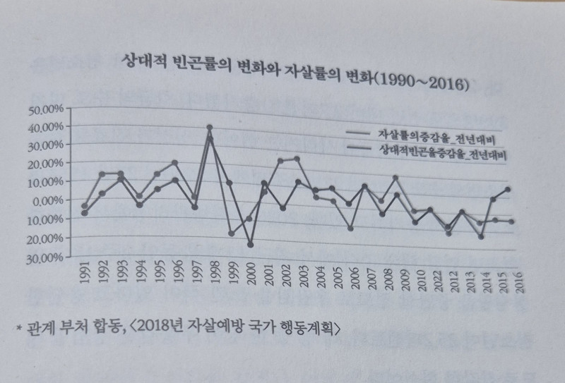 신기한 게 책에 자살률 증감 그래프와 상대적 빈곤 증감 그래프가 거의 일치한다.
