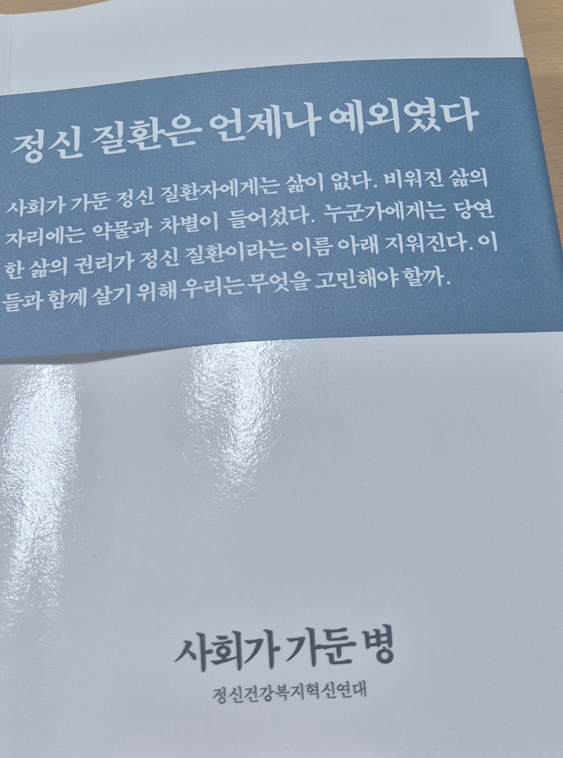 지금 읽고 있는 책은 정신건강복지혁신연대가 쓴 <사회가 가둔 병>
